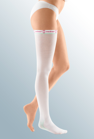 Чулки mediven thrombexin 18 предназначены для профилактики тромбоэмболических осложнений и подходят широкому кругу пациентов. Благодаря оптимальному давлению (18 мм рт. ст.) чулки могут использоваться во время родов, операций и в период реабилитации, при длительном лечении ослабленных людей в стационаре – то есть в условиях, когда риски тромбозов глубоких вен и тромбоэмболии не являются высокими, но возможны. Среди уникальных характеристик изделий – возможность контролировать правильность надевания: особый рисунок-индикатор на резинке при чрезмерном растяжении указывает на опасность нарушения кровообращения, когда резинка сдавливает бедро. Кроме того, чулки mediven thrombexin 18 отличает мягкость трикотажа и его способность равномерно растягиваться, что позволяет без труда надеть изделия, в том числе на ослабленных и малоподвижных пациентов (медицинскому персоналу при этом рекомендуется использовать вспомогательное приспособление medi Hospital Butler).