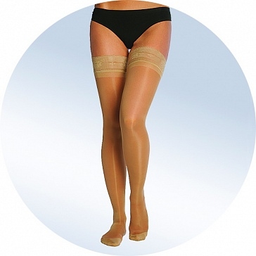 Плотные бархатистые по фактуре чулки, отлично скроют расширенные вены, капиллярные сеточки на ногах. Чулочки с красивым ажурным верхом фиксируются на ноге с помощью силиконовой ленты под кружевом. Имеют дополнительно уплотненную и сформированную стопу, пяточка и мысок сделаны без швов. Чулки повторяют форму ноги. Обладают дозированной компрессией в различных участках изделия. Максимальное давление на ногу обеспечивается в области лодыжек (18 мм рт.ст.),которое уменьшается по мере продвижения к бедрам. Такое решение помогает устранить нарушенное кровообращение в ногах, убирает последствия уменьшения тонуса вен, устраняет застойные явления, отеки, помогает предотвратить образование тромбов. Ячеистое плетение этого компрессионного трикотажа обеспечивает комфортную эластичность при носке чулок.