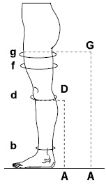 g – окружность бедра (на 5 см ниже ягодичной складки) d – окружность под коленной чашечкой (на два пальца ниже коленного сустава) b – окружность надлодыжечной области (самая тонкая часть ноги) A-D – длина от уровня D до пятки A-G – длина от уровня G до пятки |