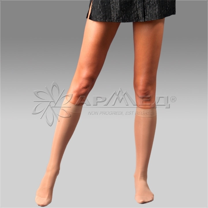 Гольфы выполнены из особого материала, который создает различную степень компрессии: от 100 % в области щиколоток (самой узкой части), до 70% в области верхней трети голени.