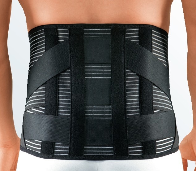 - ремни на задней поверхности бандажа крепятся таким образом, чтобы действующие на них силы способствовали уменьшению поясничного лордоза (в случае фиксации ремней по центру лордоз будет усиливаться)