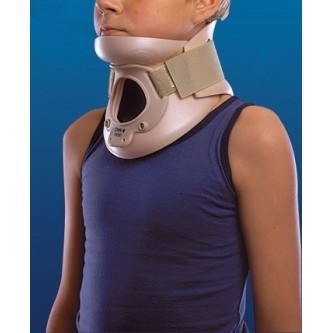 Основание ортеза опирается на плечи, верхняя часть поддерживает нижнюю челюсть и затылок, препятствуя сгибанию-разгибанию шеи и защищая шейные позвонки.