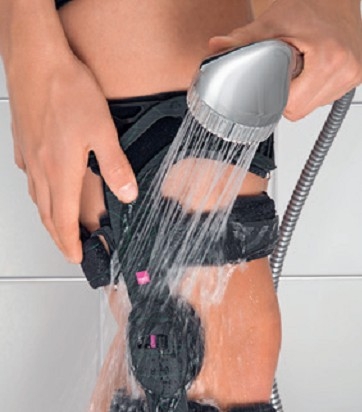 Ортез M.4s X-lock имеет гидрофобное покрытие на мягких вставках, поэтому может применяться даже во время занятий в бассейне без ущерба для стабильности ортеза на ноге. Если пациент будет использовать ортез в воде, необходимо после бассейна ополоснуть ортез чистой водой (можно даже не снимая с ноги). Шарнир скорее всего смазывать не придется, но если вдруг он начнет издавать неприятные звуки, то необходимо использовать тефлоновую смазку.