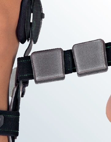 Принципиальное отличие M.4 X-lock от других ортезов в том, что он позволяет не только иммобилизовать коленный сустав в положении разгибания, но и одномоментно перейти от этого состояния в фазу свободного/ограниченного движения в суставе. Для этого достаточно поменять положение переключателей на боковых поверхностях шарнира (зеленый индикатор – фаза движения; малиновый индикатор – иммобилизация).